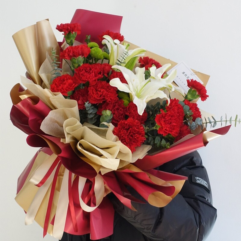 【岁月长留】19朵红色康乃馨,1支白色多头香水百合 ,搭配满天星装饰。