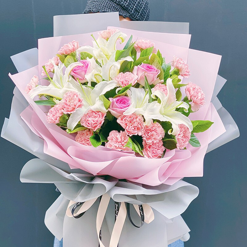 【祝福悠长】精选19朵粉色康乃馨,3朵粉玫瑰,2支多头白色香水百合,搭配栀子叶等绿叶装饰。