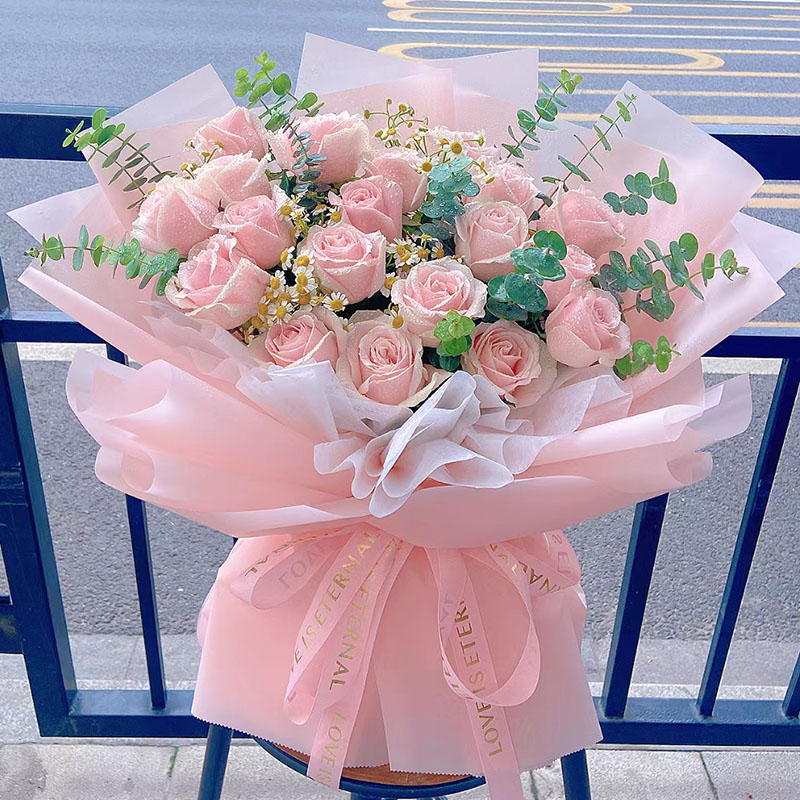 【风雅颂】19朵粉玫瑰,搭配尤加利叶、洋甘菊装饰。