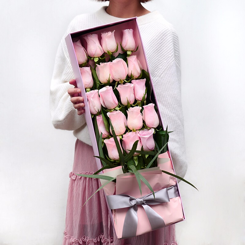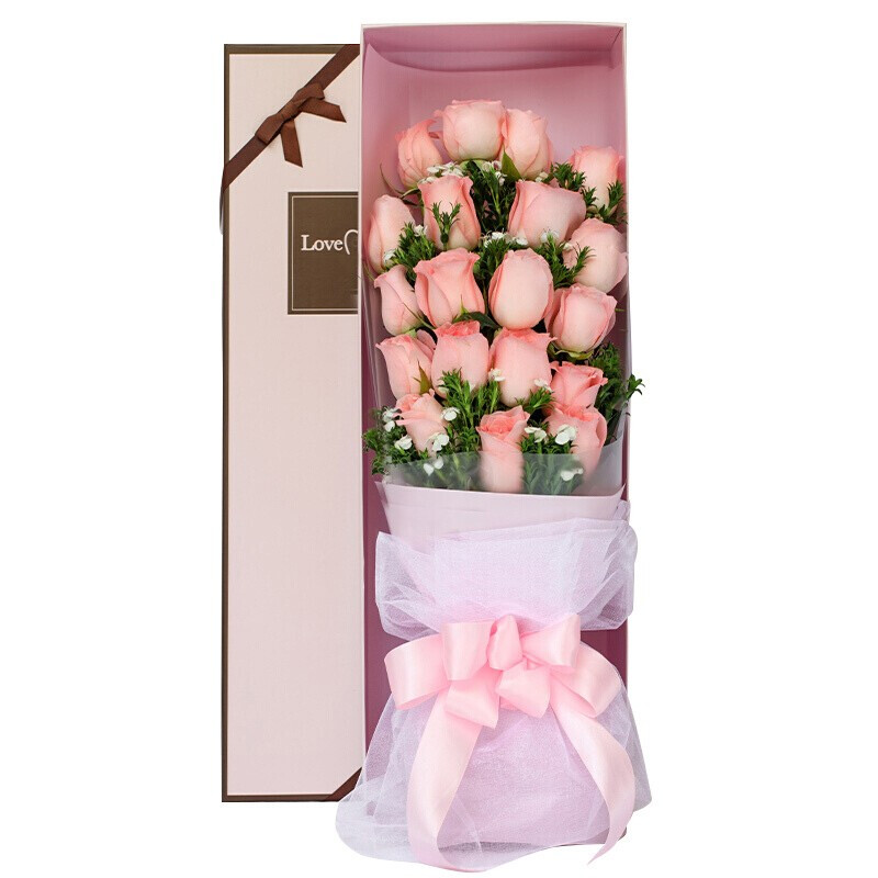 【情窦初开】19枝精品粉玫瑰,搭配叶上金、绿叶。