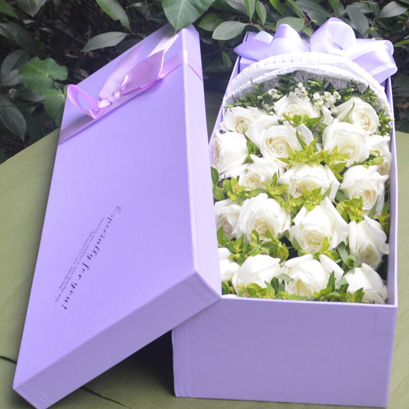 【岁月静美】11朵顶级白玫瑰,搭配勿忘我(或紫色满天星)外围环绕。