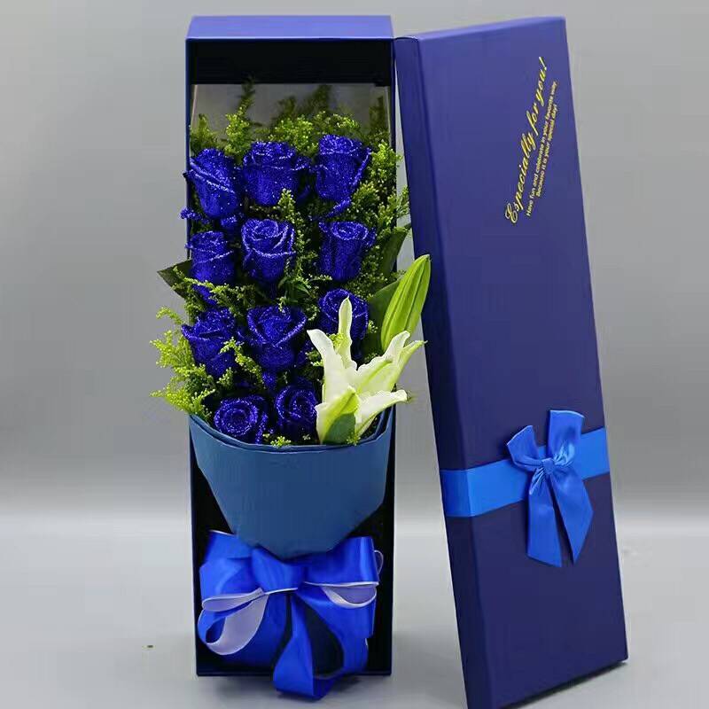 【思念的季节】11支蓝玫瑰,21朵白色香水百合外围环绕,满天星装饰。