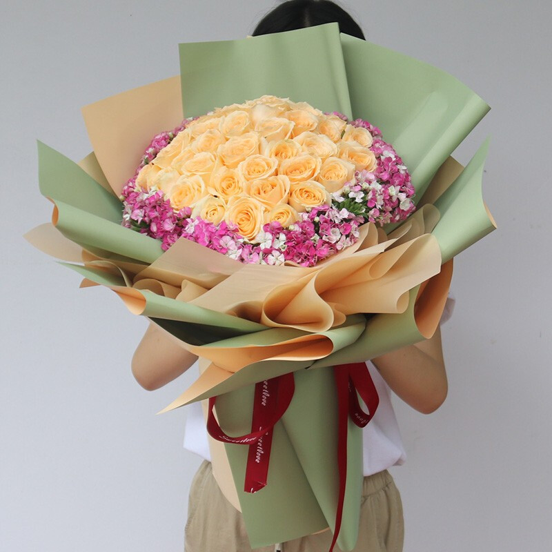 【纯心给你】33支香槟玫瑰,搭配适量叶上黄金