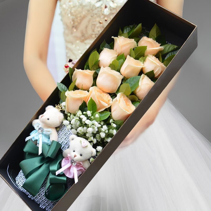 【世间有你】11朵香槟玫瑰,2只可爱小公仔,栀子叶,满天星间插丰满。