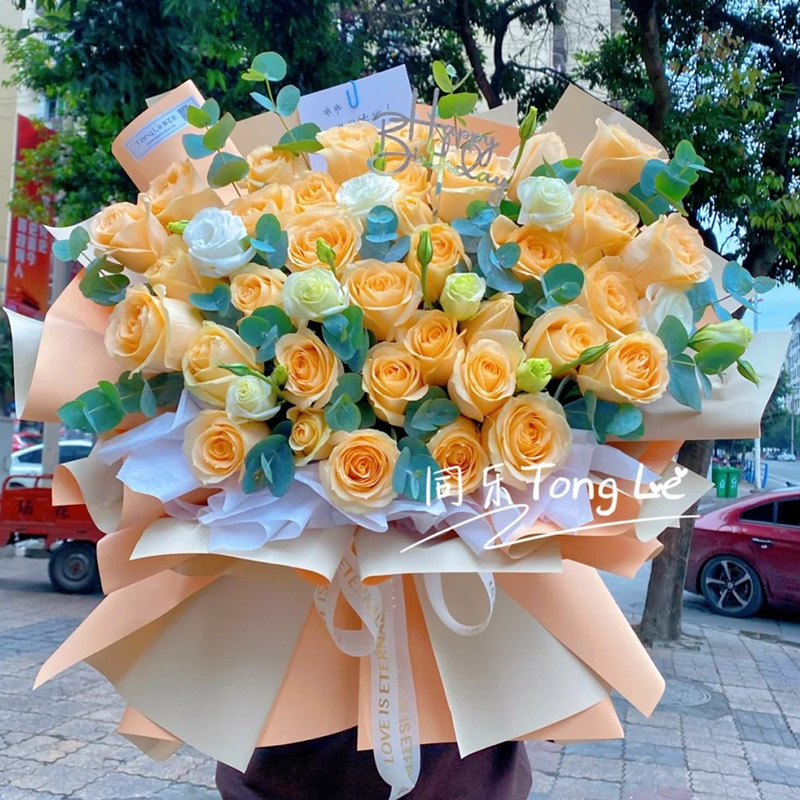 【星辰点点】33支精品香槟玫瑰,搭配5支洋桔梗(断货则用同数量白玫瑰代替),尤加利叶装饰。