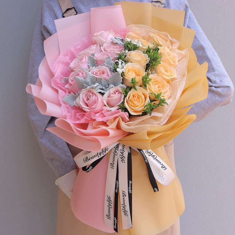【一半烟火一半清欢】精选18朵玫瑰,半边9朵粉玫瑰搭配银叶菊,半边9朵香槟玫瑰搭配石竹梅。