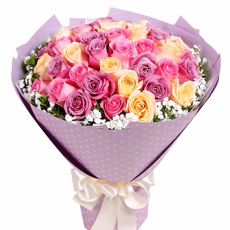 【永恒的陪伴】33枝混搭粉玫瑰、香槟玫瑰、紫玫瑰,外围白色相思梅;