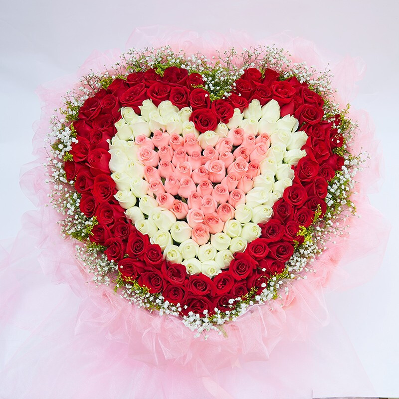 【慢慢爱】99朵混搭玫瑰(红玫瑰,白玫瑰(或香槟玫瑰),粉玫瑰,)三色心形造型,外围黄莺草、满天星装饰。