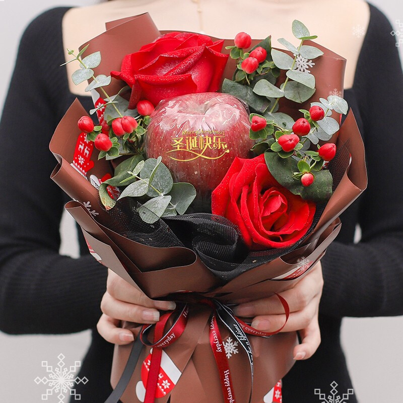 【甜蜜圣诞】精选9朵红玫瑰,8粒费列罗巧克力,1颗红苹果,2只小熊,搭配满天星、栀子叶装饰。