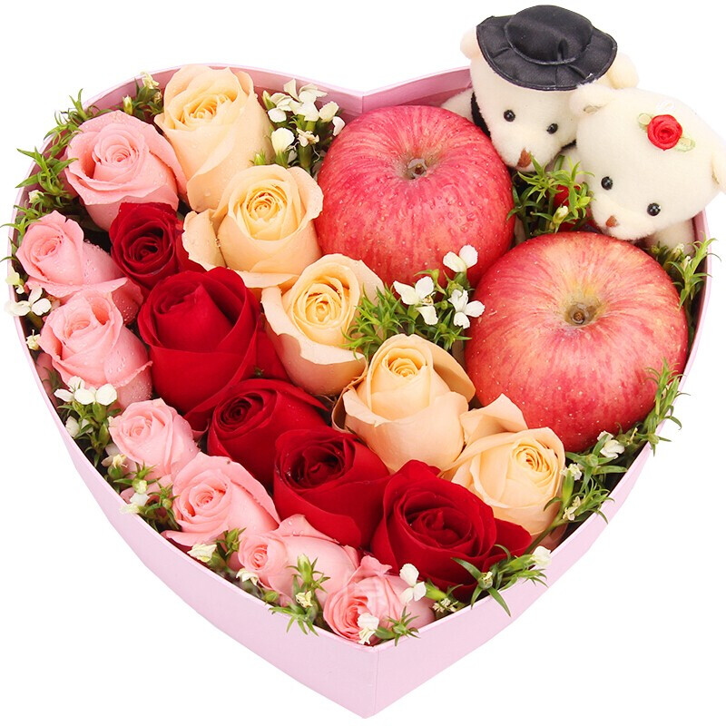 【温暖平安夜】17朵混搭玫瑰(香槟色5朵,红色6朵,粉色6朵),2颗苹果,2只小熊,搭配石竹梅点缀。