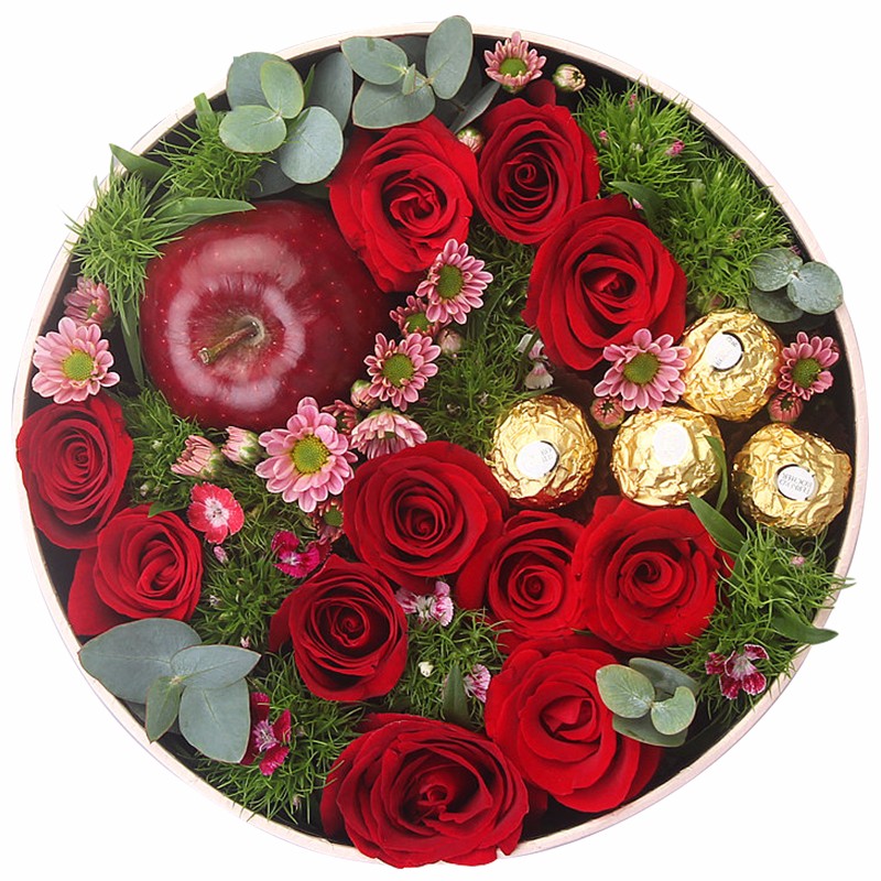 【真心想你】红苹果1颗、红玫瑰11朵、费列罗巧克力4颗,搭配适量石竹梅、尤加利叶、小菊花装饰。
