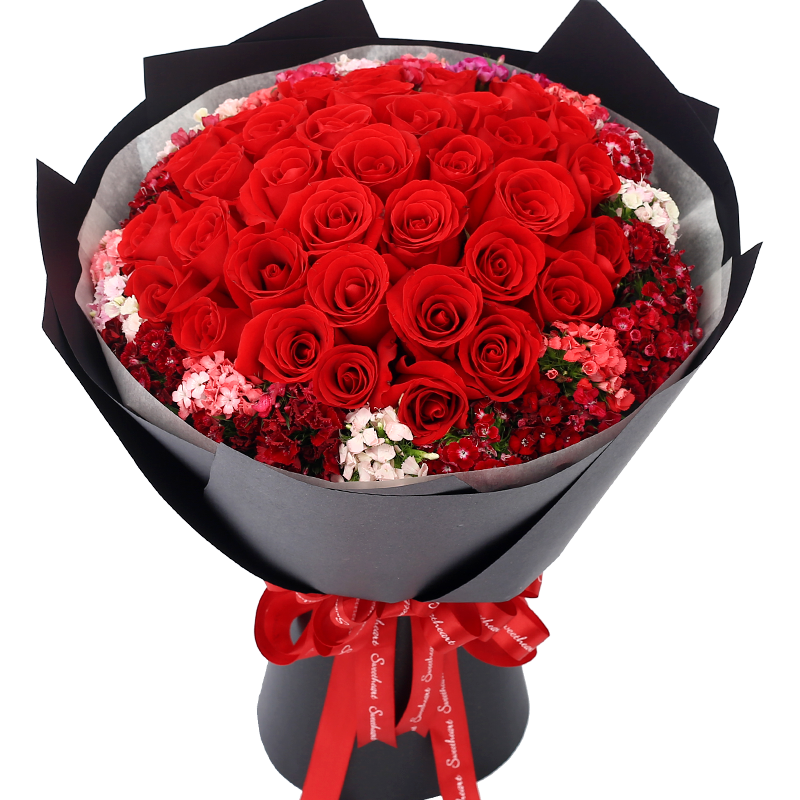【真诚的爱】33支精品红玫瑰,外围搭配红粉白色石竹梅(或同色系满天星)丰满环绕。