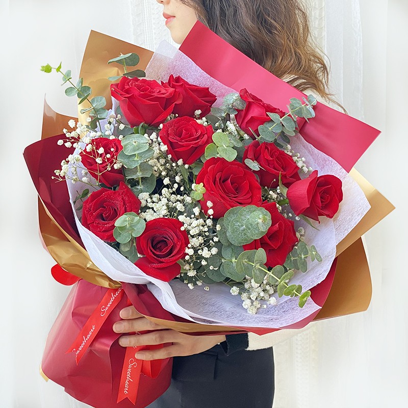 【一心一意的爱】11枝卡罗拉红玫瑰、搭配白色满天星、尤加利点缀。