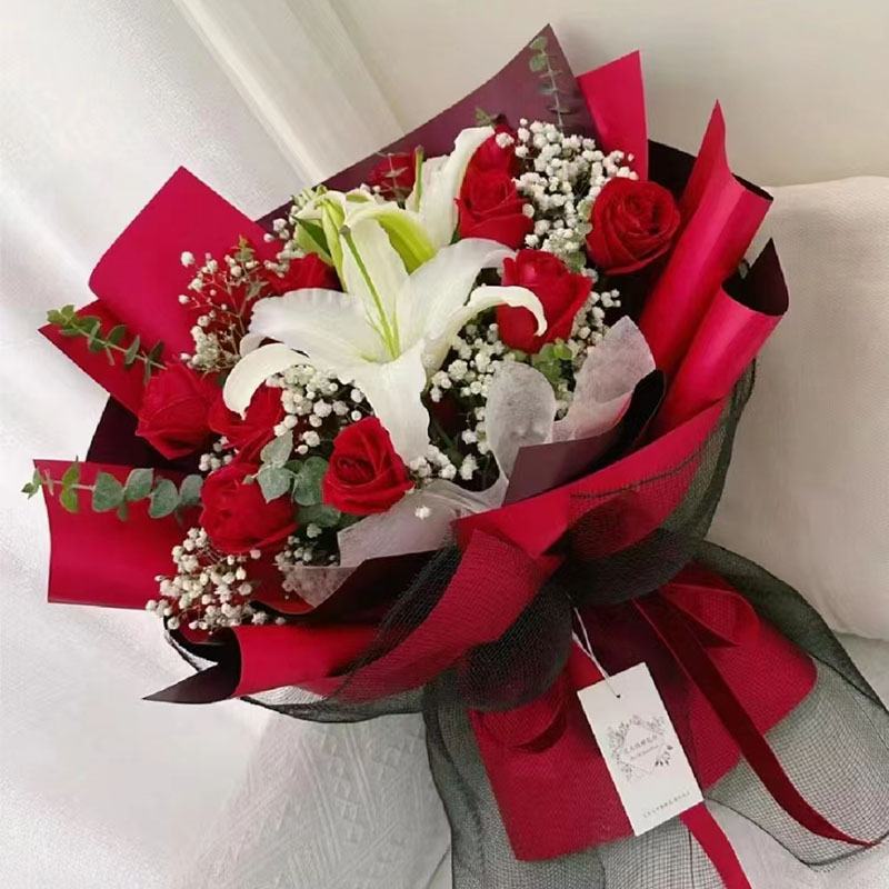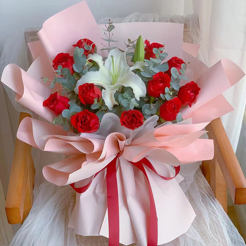 【永恒爱恋】11朵红玫瑰,1支白色多头香水百合,搭配满天星、尤加利叶装饰。