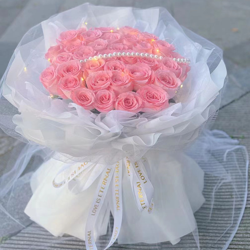 【锦瑟年华】精选33朵粉玫瑰,1条灯串,1条珠串装饰花面。