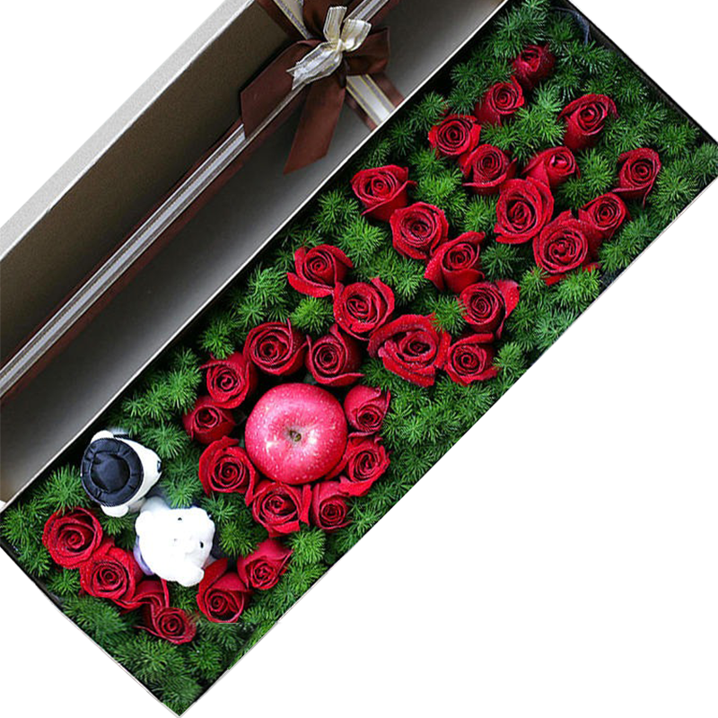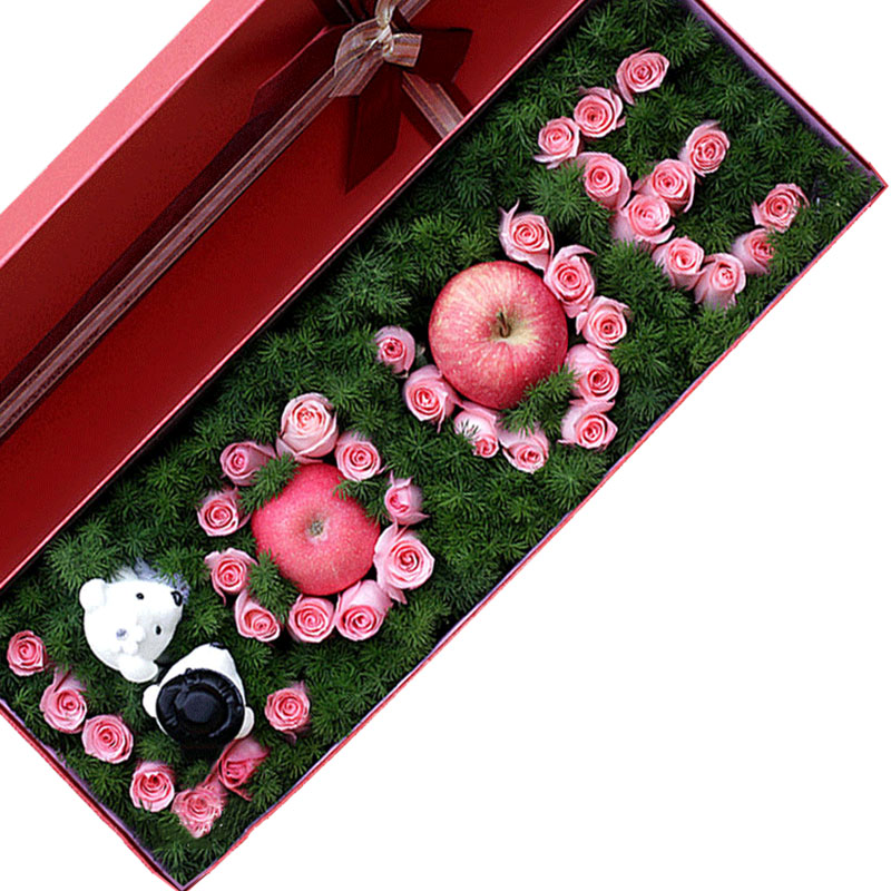 【小仙女】红苹果1颗、红玫瑰33朵(拼字LOVE)、可爱小熊2只,搭配适量天冬门装饰。