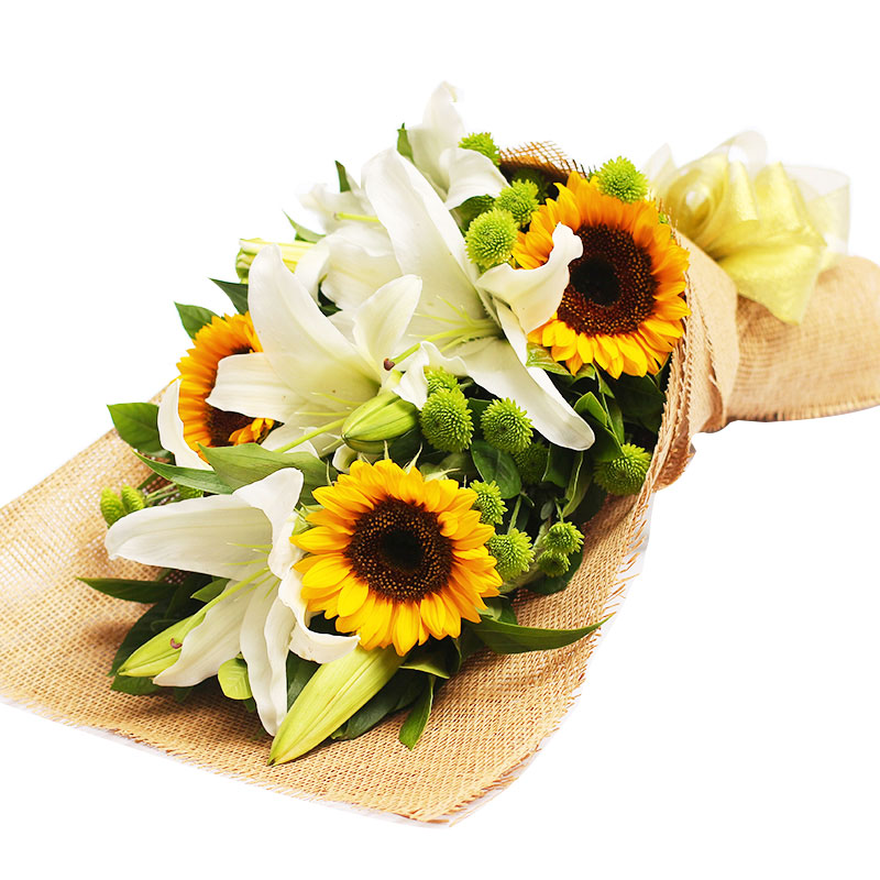 【你和阳光都在】3朵向日葵,3枝多头白色香水百合,搭配小雏菊、栀子叶。