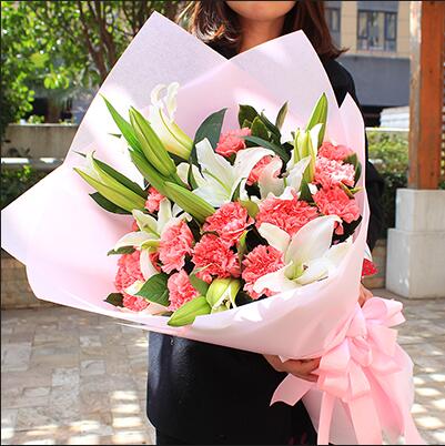 【千纸鹤】精选13支粉色康乃馨,9朵香水百合,绿叶点缀。