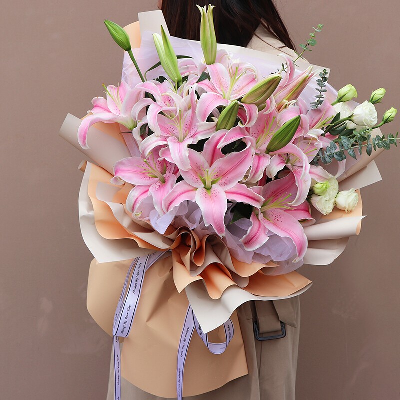 【恰似你的温柔】8枝粉色多头西伯香水百合,搭配绿色新鲜叶材。