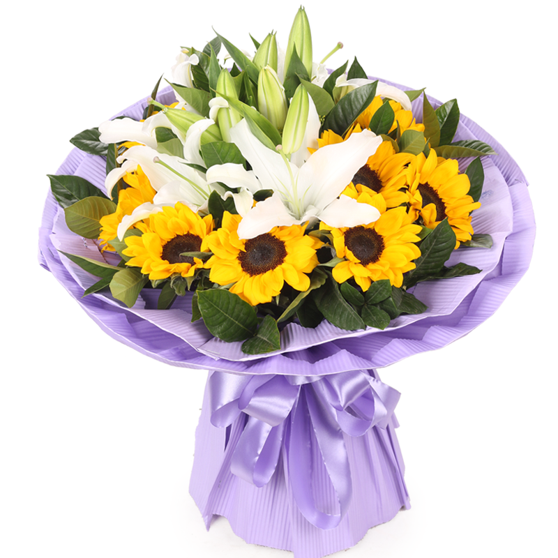 【你和阳光都在】3朵向日葵,3枝多头白色香水百合,搭配小雏菊、栀子叶。