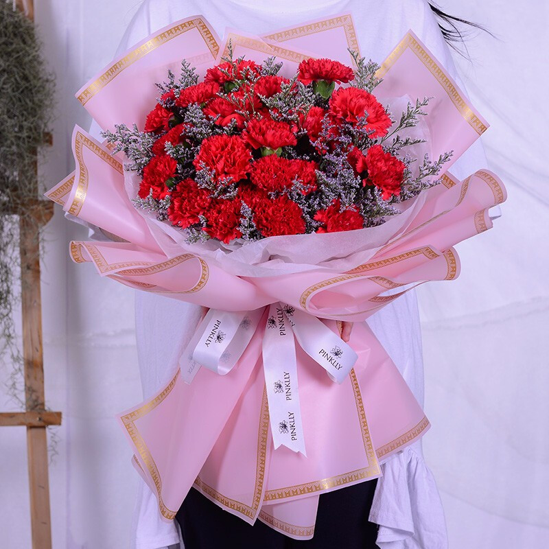 【我心依旧】99朵红色康乃馨,石竹梅外围环绕。
