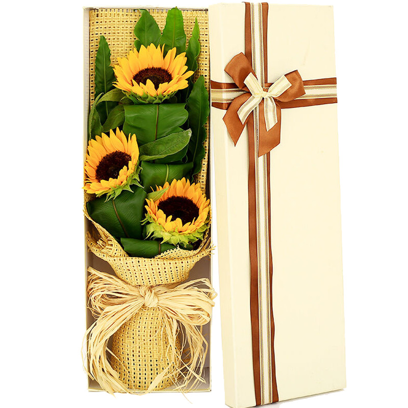 【大爱无私】3支精品向日葵,搭配适量绿叶,拉菲草席内包。