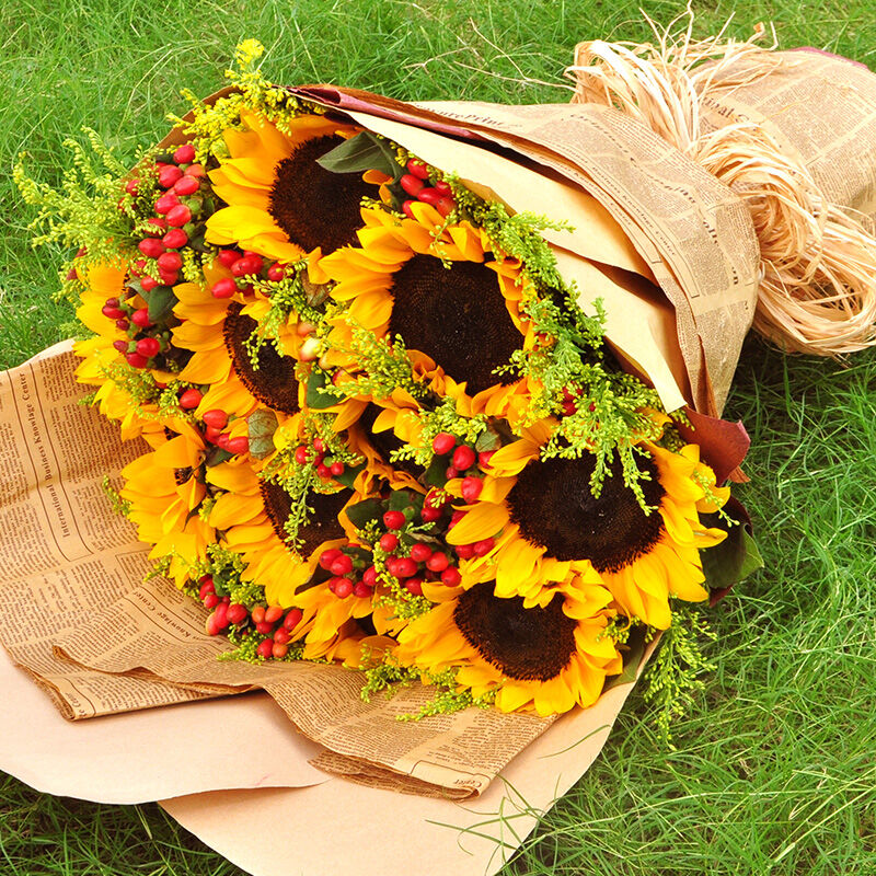 【暖暖情义】精选99朵向日葵,相思梅点缀,牛皮纸外包,同色系香槟色花结。