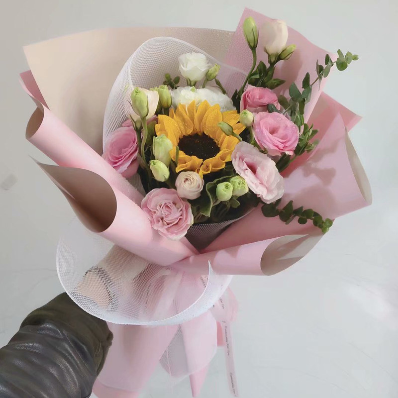 【快乐阳光】1支向日葵,5支洋桔梗,3支白桔梗(若洋桔梗断货,则用5支粉玫瑰、3支白玫瑰代替),搭配尤加利叶、绿叶装饰。