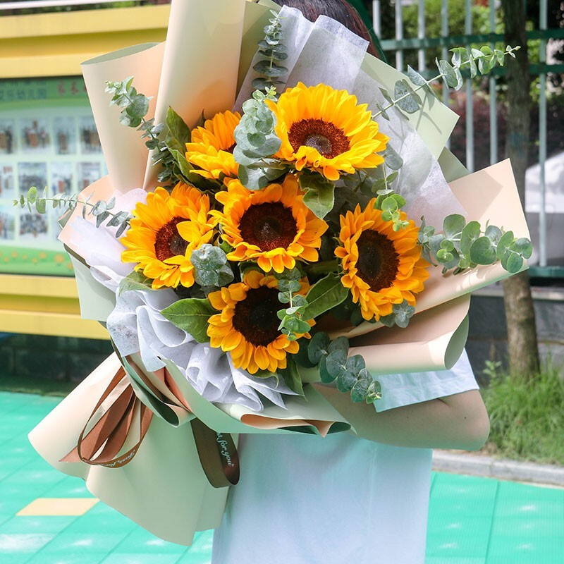 【温柔时光】精选6支向日葵,搭配尤加利叶、绿叶装饰。