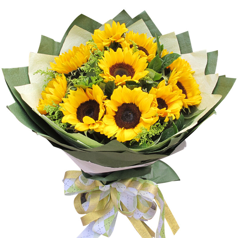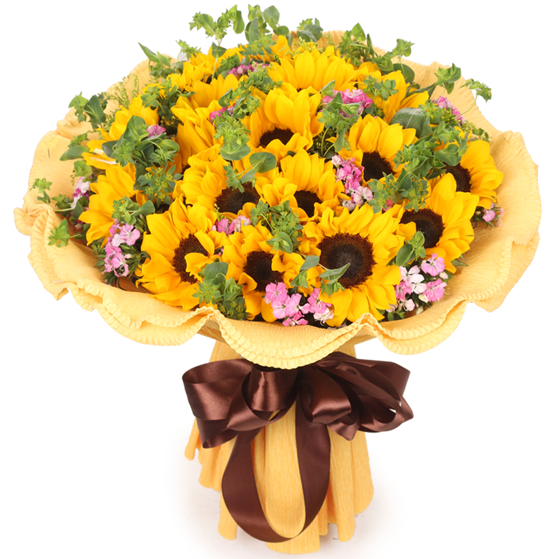 【赤道情书】19支精品向日葵,搭配叶上黄金、石竹梅装饰。