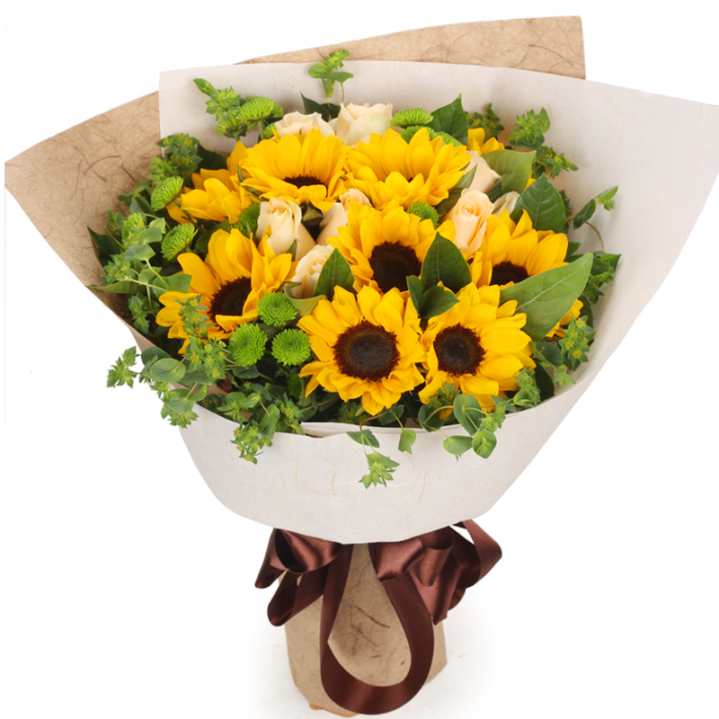 【清新靓丽】9支精品向日葵,9支精品香槟玫瑰,绿色小雏菊,叶上黄金,绿叶点缀。