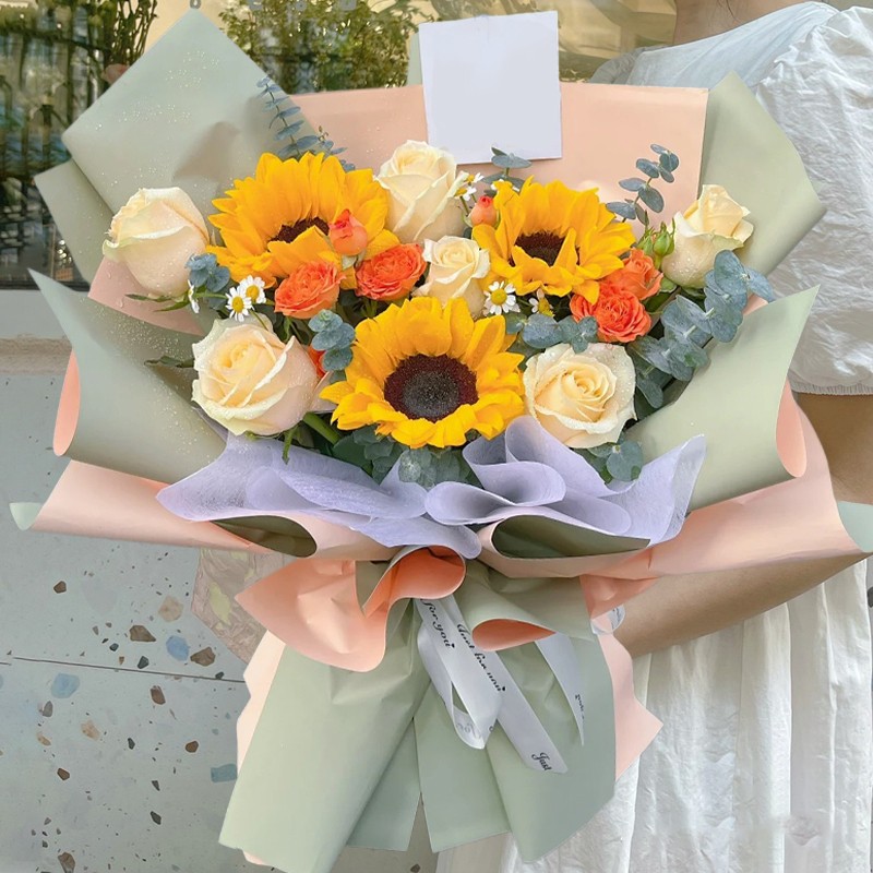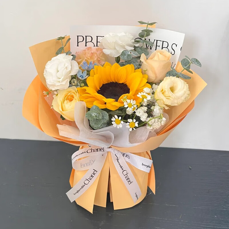 【南歌唱晚】3支向日葵,8朵香槟色玫瑰,搭配3支白色洋桔梗(断货则用3朵白玫瑰代替),尤加利叶、满天星装饰。