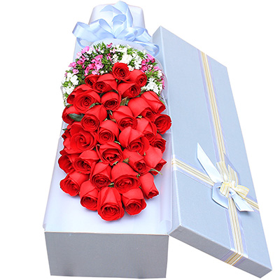 【爱你成痴】33枝红玫瑰,搭配石竹梅装饰。
