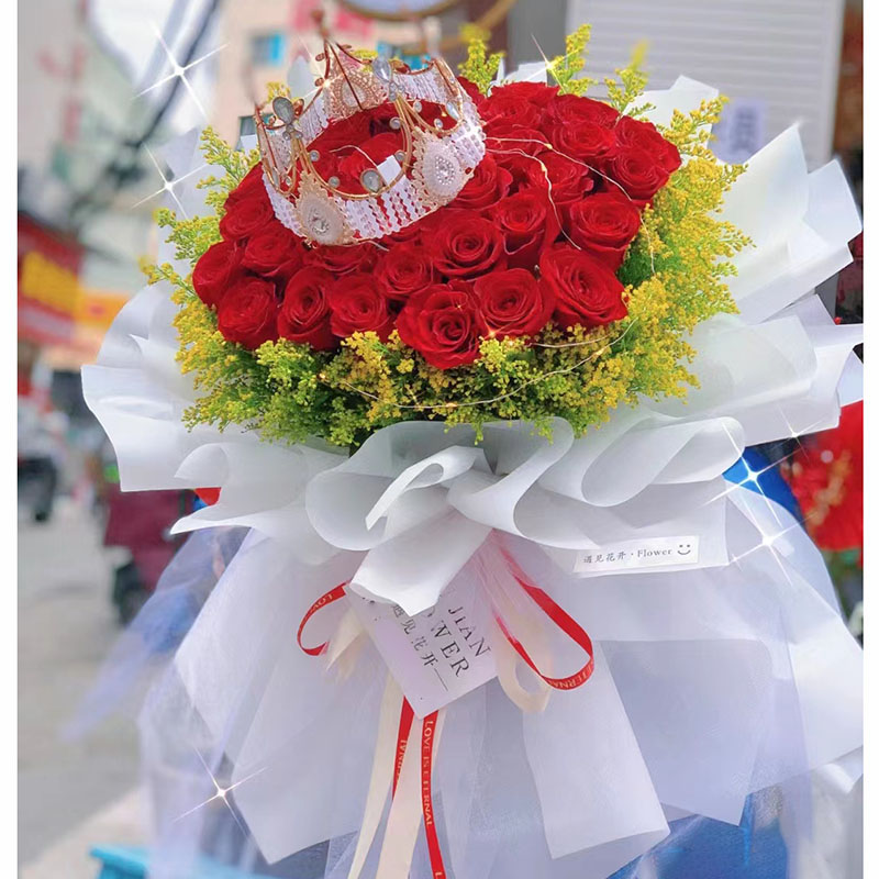 【爱情密码】33朵红玫瑰,1条灯串,1个皇冠(款式随机),搭配黄莺草外围环绕装饰。