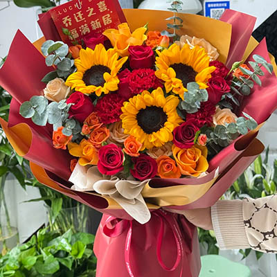【金辉满载】精选3枝向日葵,19朵玫瑰康乃馨混搭(红玫瑰和红色康乃馨为主,金辉玫瑰、香槟玫瑰),5枝多头橙色泡泡,搭配尤加利叶装饰。