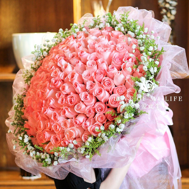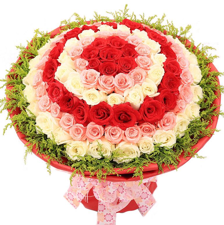 【一生等一人】99朵玫瑰(22朵红、33朵粉、44朵白玫瑰),黄莺环绕。