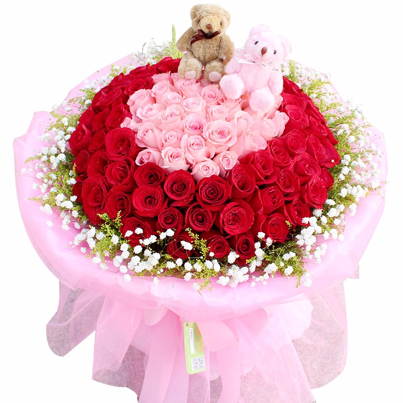 【甜蜜的幸福】99支精品混色玫瑰(红玫瑰、粉玫瑰)+2只可爱小熊,搭配适量白色满天星、黄莺。