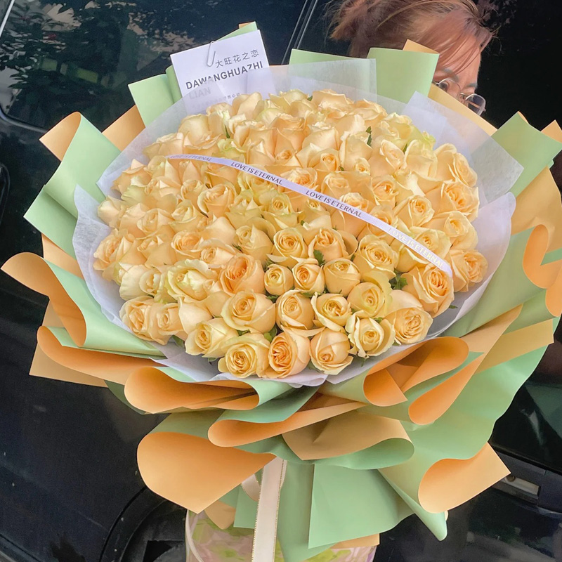 【全都是你】99朵香槟玫瑰,搭配缎带装饰花面。