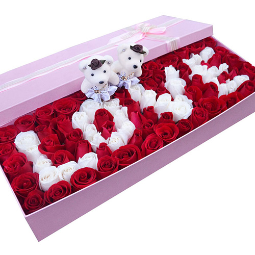 【LOVE-爱你一辈子】99枝(红玫瑰+白玫瑰)拼成LOVE字样,一对情侣小熊。