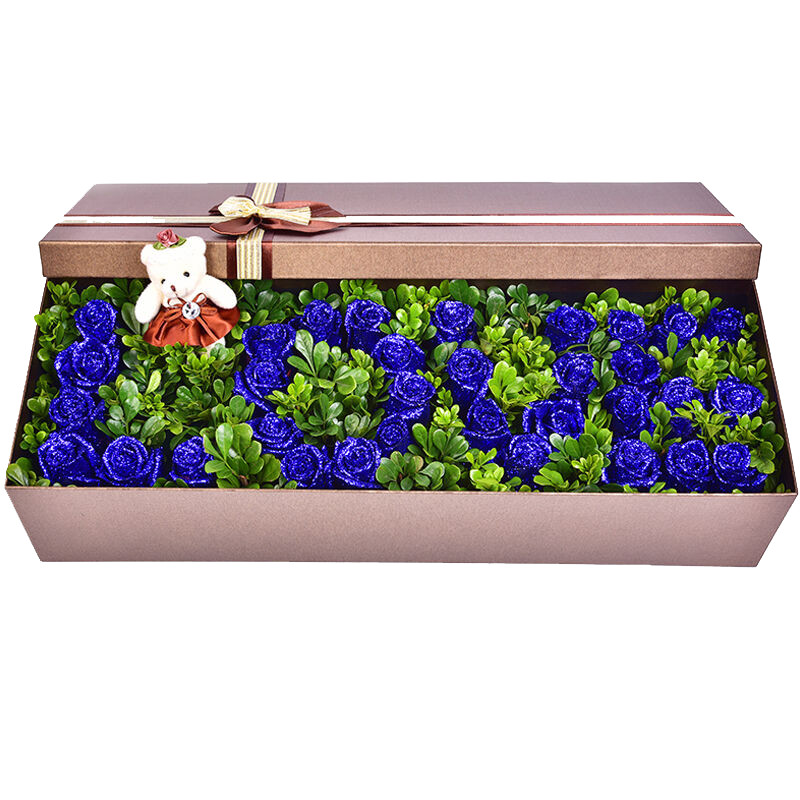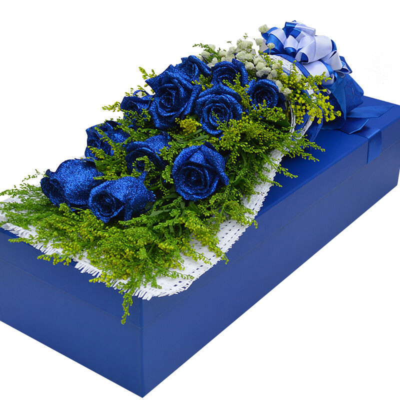 【蓝色大海】99朵蓝玫瑰,栀子叶,相思梅围绕。