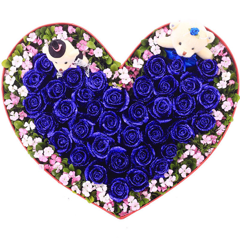 【爱之初心】33支精品蓝色妖姬+2只可爱小熊,搭配适量相思梅。