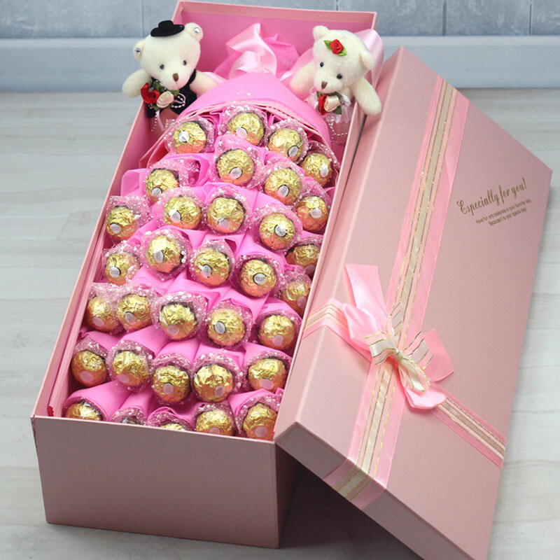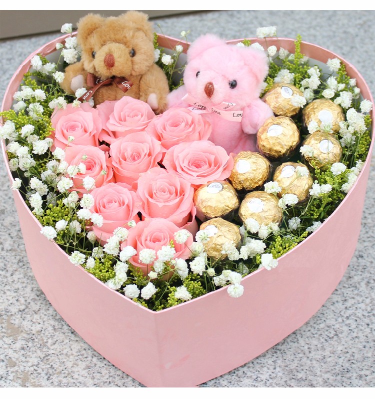 【心心相印】9朵顶级粉玫瑰,9颗费列罗,一对可爱小熊,满天星、栀子叶围边环绕。