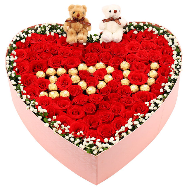【幸福的糖衣】73朵精品红玫瑰,26颗巧克力,2只小熊,满天星环绕。