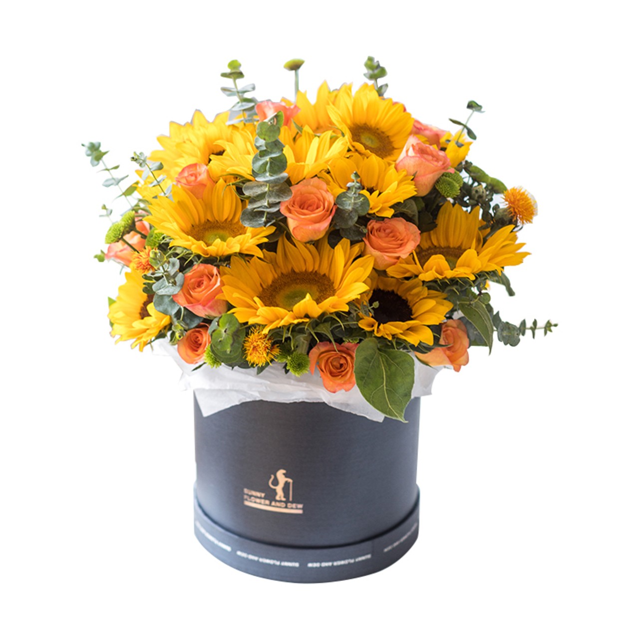 【繁花世界】精选11朵香槟玫瑰,3朵向日葵,搭配红豆、尤加利叶装饰。