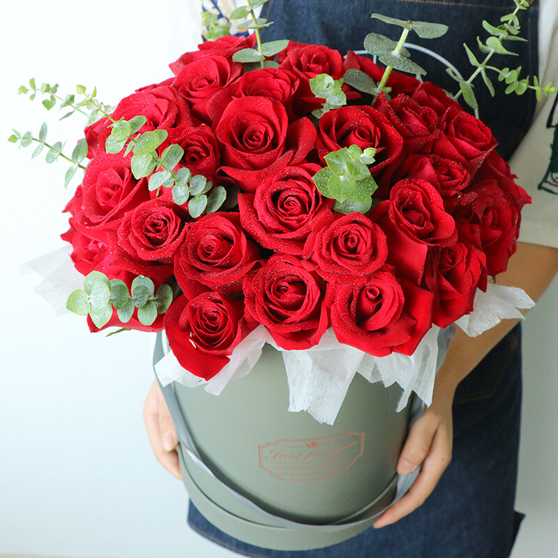 【为爱疯狂】33朵精品红玫瑰,尤加利叶,绿叶装饰。