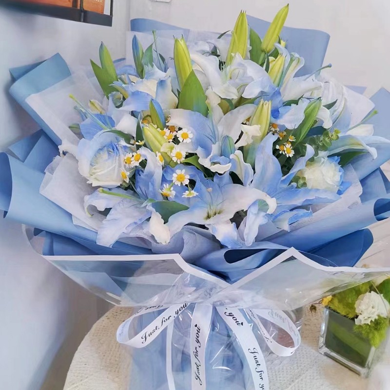 【蓝色浪漫】6枝多头碎冰蓝百合,2朵碎冰蓝玫瑰,小雏菊搭配