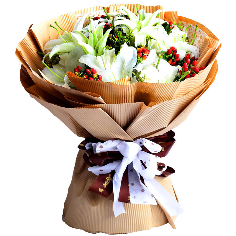 【给你的幸福】精心挑选15朵白香水百合,外围黄莺点缀。