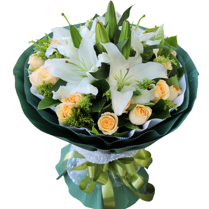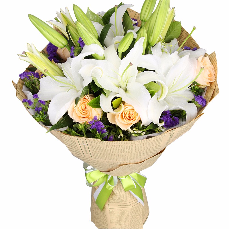 【祝福予你】6支香槟玫瑰,5支多头白百合,搭配适量紫色勿忘我、栀子叶、白色相思梅。