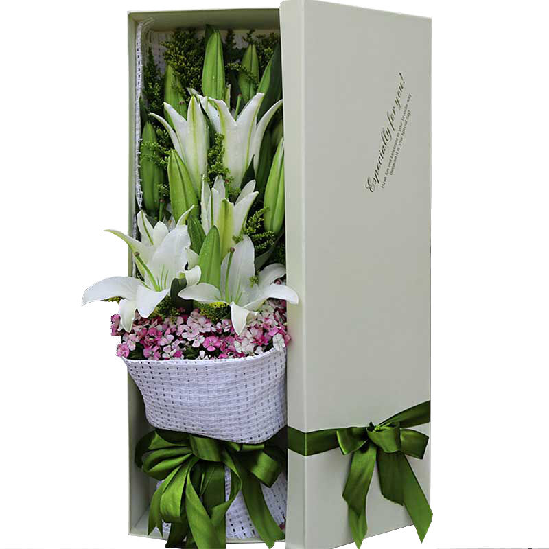【思念如许】12朵香水百合礼盒+黄莺,绿叶丰满点缀