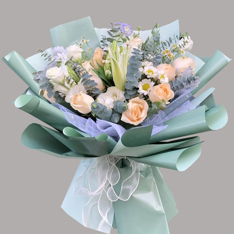 【皎洁如玉】8朵香槟玫瑰,3朵白玫瑰,1支白色多头白百合,搭配3支白桔梗,小雏菊,尤加利叶装饰。